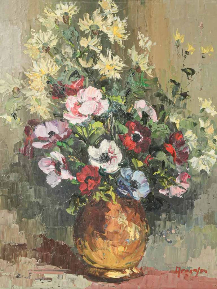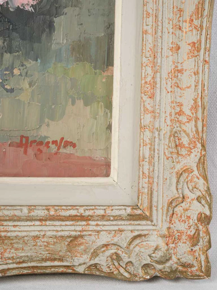 This charming still life painting, featuring a vibrant bouquet of flowers in a golden vase, framed in a delicately carved and distressed wooden frame, brings a touch of vintage romance to any space. The thick, textured brushwork brings the flowers to life. The yellow, pink, and red blooms, as well as the bright vase contrast beautifully with the rich green foliage and muted background. It’s this unpretentious charm that makes the piece so versatile.