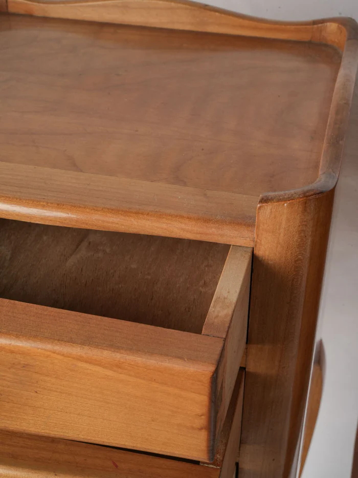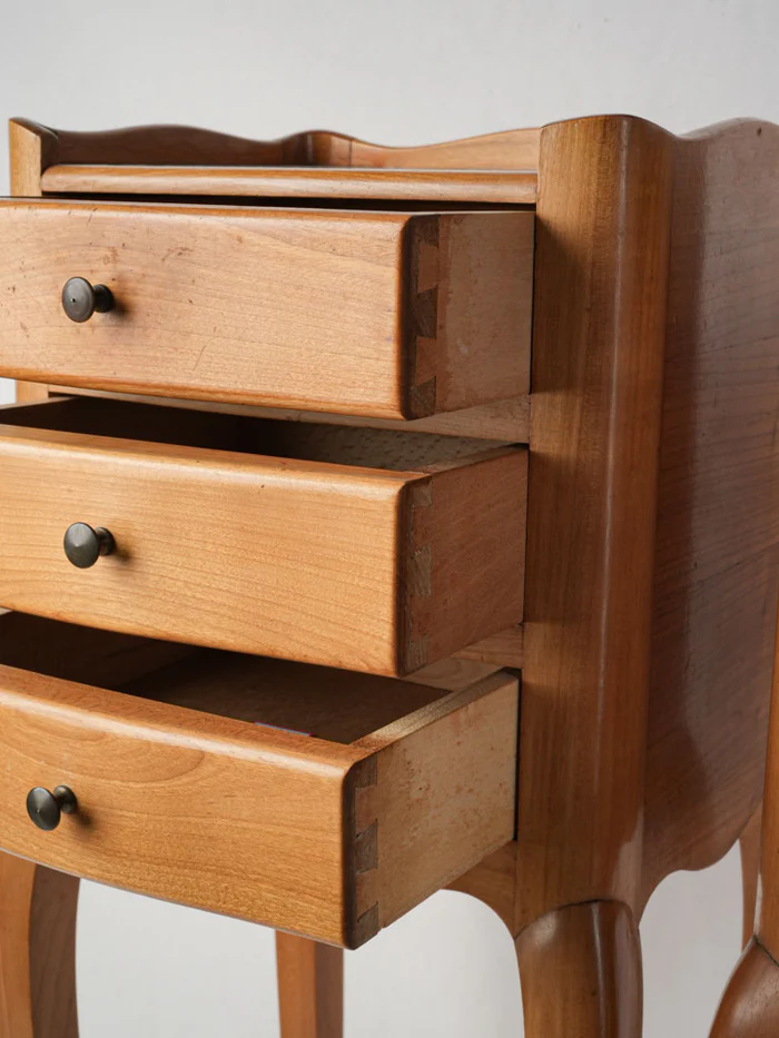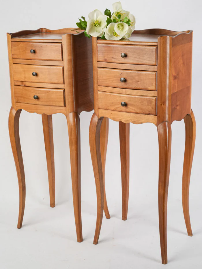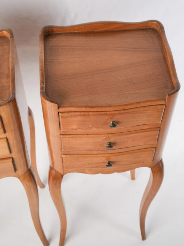 This charming pair of nightstands or side tables is crafted from warm-toned fruitwood and showcases an elegant blend of simplicity and French-inspired curves. Each piece features three drawers with small round metal pulls and a subtly scalloped apron and tabletop edge, lending a soft, decorative touch. Their gracefully slender cabriole legs bring a light, airy presence and a sense of timeless refinement. Their handcrafted look and curved profiles evoke a subtle nod to Louis XV-style furniture, while their functional storage makes them as useful as they are decorative.