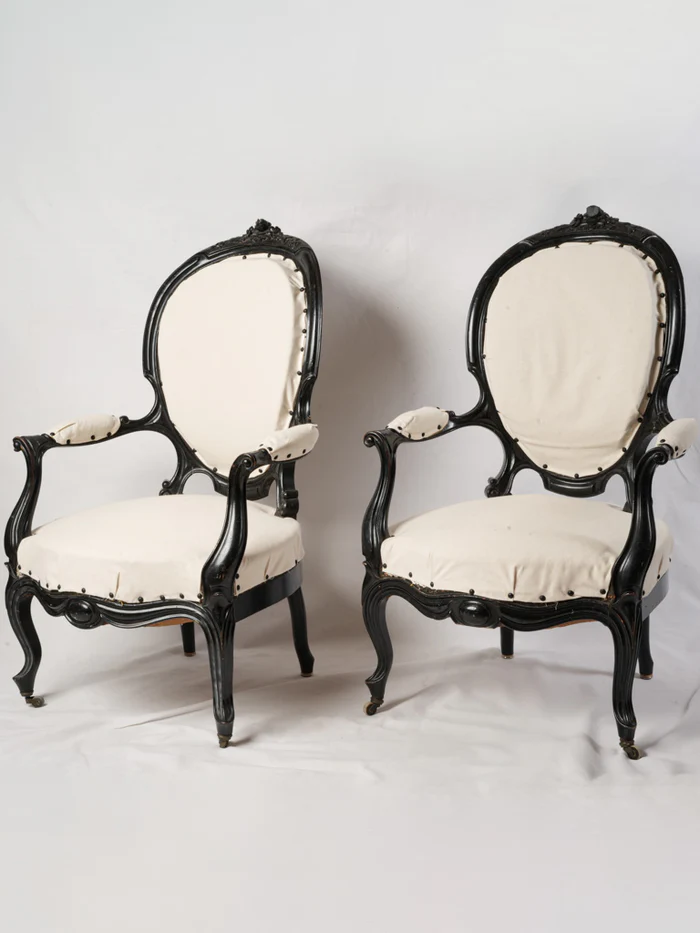 This elegant and dramatic pair of Napoleon III armchairs dates to the late 19th century and showcases the refined curves and sculptural presence typical of French design during the Second Empire (1852–1870). Crafted from richly blackened wood, the frames feature graceful cabriole legs, scroll arms, and delicately carved floral crests that add dimension and flair to the silhouette. The oval backs and deep seats are generous in scale and proportion, offering a good level of comfort. There are minor losses to the carving, most notably to the crest of one chair, which do not detract from their overall character and historical charm.